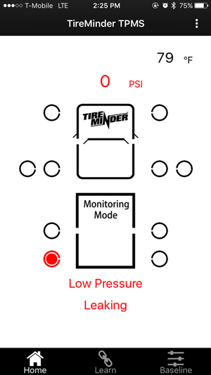 In the event of a tire issue, the appropriate alert will be displayed in both the app and a push notification on your phone. Also, the Bluetooth Adapter will blink red and beep.